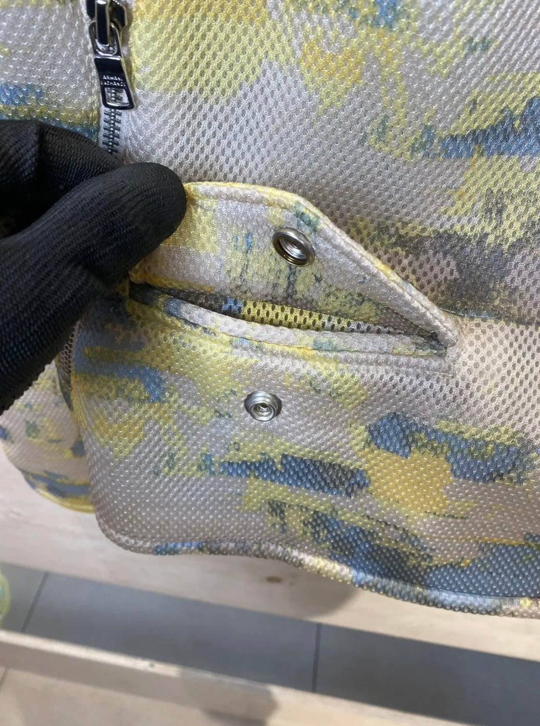 Color: Multi-tone (blue, yellow, cream abstract mesh)