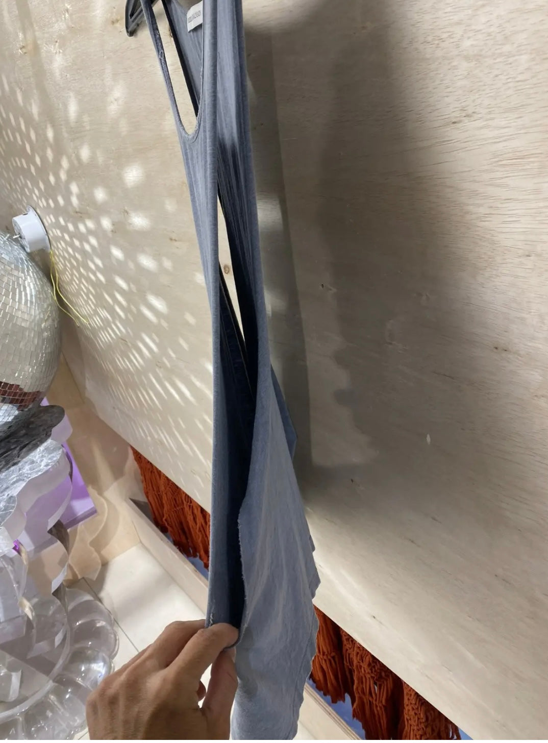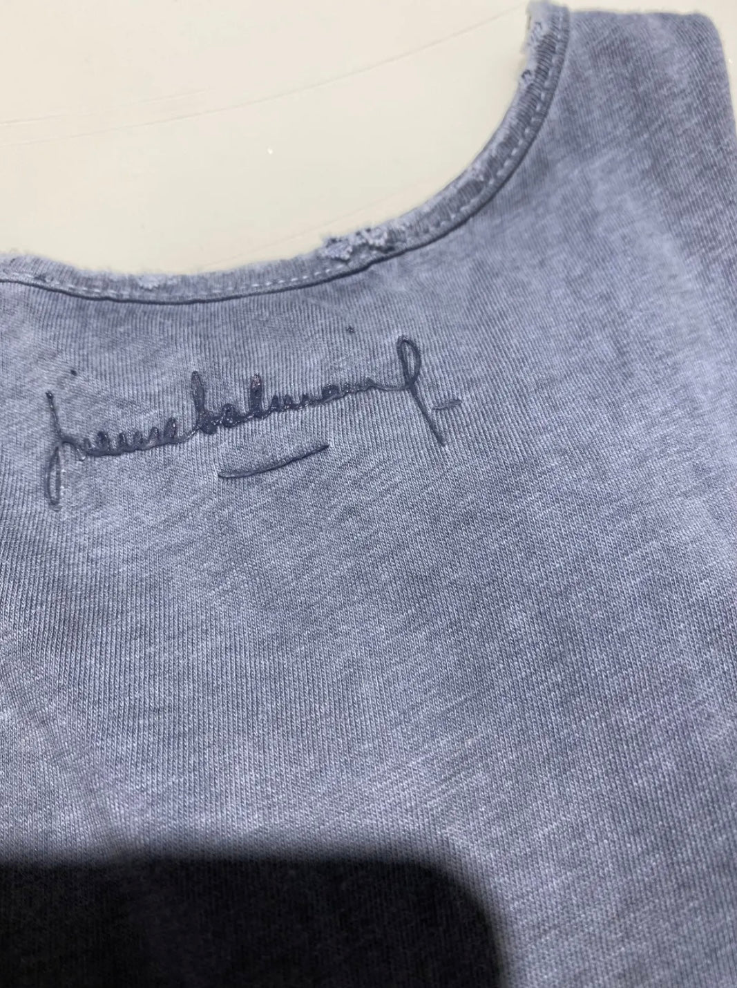This vintage Pierre Balmain Sleeveless Tee features a grey-toned body with deliberate distressed detailing that adds edge and personality. The straight, slightly relaxed cut frames the torso while the raw, cut-off sleeves emphasize its avant-garde aesthetic.