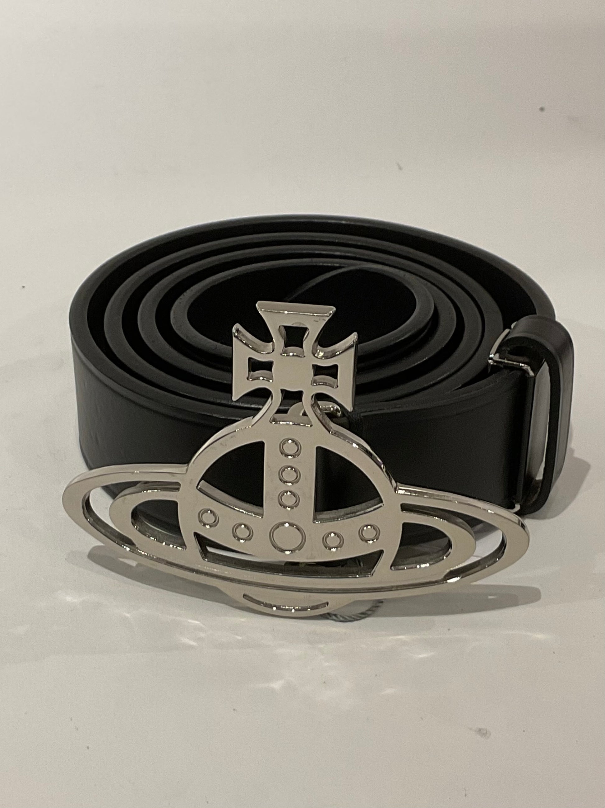 This Vivienne Westwood belt in plain black exudes effortless sophistication. With a width of 1.5 inches and a length of 46 inches, it’s perfect for waist sizes up to 46 inches. The silver signature Vivienne Westwood buckle adds a sleek, timeless touch, making it ideal for both casual and formal outfits. Crafted from high-quality leather, this belt is durable yet stylish—an authentic, must-have accessory for any wardrobe.